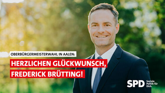 Die SPD Baden-Württemberg gratuliert Frederick Brütting sehr herzlich zur Wahl als Oberbürgermeister der Stad Aalen. Der 37-jährige Sozialdemokrat setzte sich bereits im ersten Wahlgang deutlich mit über 71 Prozent der Stimmen gegen seine vier Mitbewerber*innen durch.